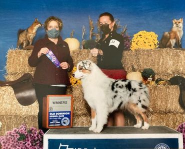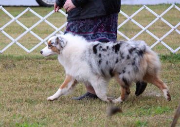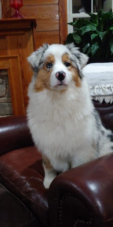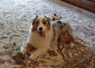 Frosty came to us from our friend Debbie Cox of Triple H Aussies. She is the most happy go lucky Aussie you will ever meet. Nothing phases her! She adores people and is so easy to live with and be around. She loves swimming, hiking and going to Bass Pro where strangers can love on her! She is a beautiful ball of fluff that just draws attention everywhere she goes! She only needs 4 more points for her AKC Champion.