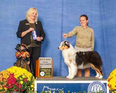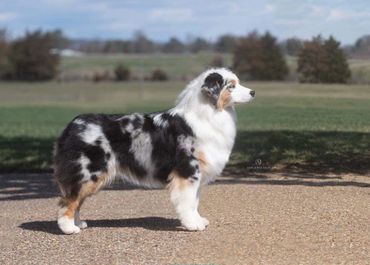 Party is from our co-bred litter with Maren Smith at Runway Aussies. Her parents are River and Frosty. She is beautiful, smart and sweet just like her parents. She finished her AKC Championship with ease at just 10 months old with three big major wins. She loves running along side the four wheeler and swimming in the pond. She has never met a stranger and loves to smile when she first meets someone. A beautiful girl with a fun personality.